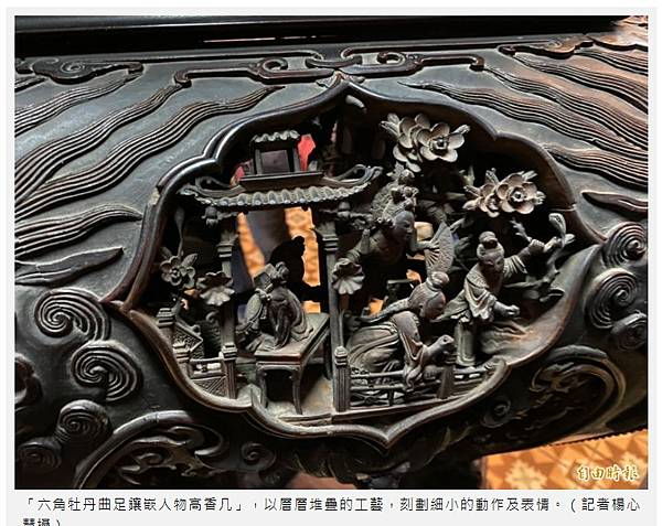 「六角牡丹曲足鑲嵌人物高香几」,以台灣肖楠為木作結構,以六堵刀馬人物作為題材,甚至雕刻以層層堆疊的工藝,刻劃細小的動作及表情。(記者楊心慧攝)