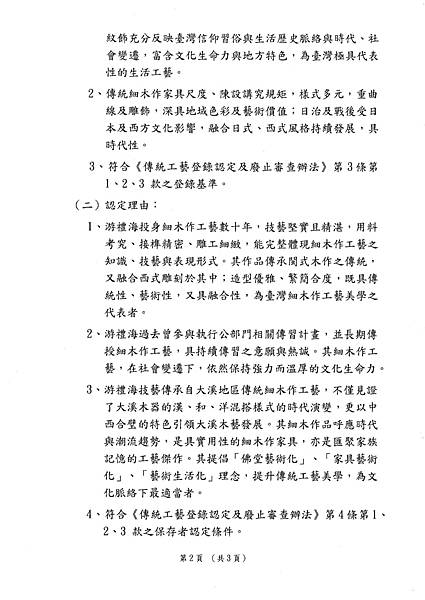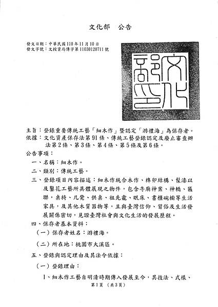 指定/登錄2021-11-10文授資局傳字第11030120711號登錄細木作暨認定保存者游禮海藝師