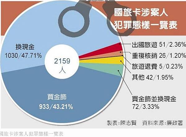 廉政署指出,最常見的國旅卡犯罪態樣,為「假消費換現金」,共有1030人,占總犯案人數47.71%,其次是有公務人員消費不得核銷的項目,如金飾、國外旅遊或儲值票券等,此外,包括「事後退款換現金」和「重複核銷」等也是常見的詐領手法。