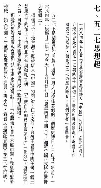 但是只要看看康熙皇帝的兒子雍正的這句話─「台灣地方自古不屬中國,我皇考聖略神威,拓入版圖。」就可以戳破他們的妄言。再不然,看看《皇清職貢圖》卷三也有記載:「台灣自古不通中國,本朝始入版圖」。這個「始入版圖」的日子,就是五二七。