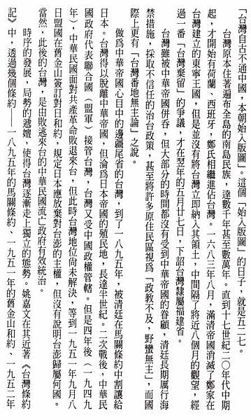 做為中華帝國心目中的邊疆尾省的台灣,到了一八九五年,被清廷在馬關條約中割讓給日本。台灣得以脫離中華帝國,但淪為日本帝國的殖民地,長達半世紀。二次戰後,中華民國政府代表聯合國(盟軍)接管台灣,台灣又受中國政權管轄。但是四年後(一九四九年),中華民國面對共產革命敗退來台,但此時台灣地位尚未解決,等到一九五一年九月八日盟國在舊金山簽訂對日和約,規定日本應放棄對台澎的主權,但沒有說明台澎歸屬何國。當然,此後的台灣,是由敗逃來台的中華民國流亡政府有效統治。