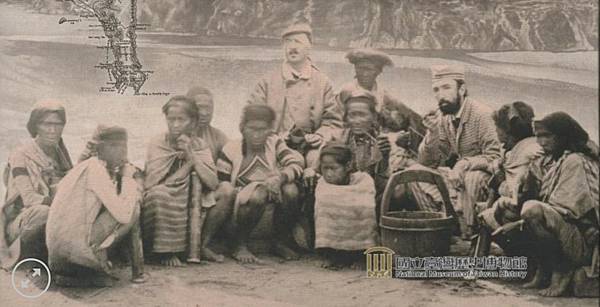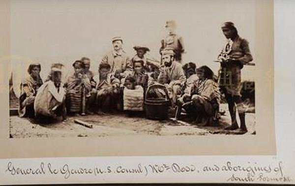1.本物件為美國領事李仙得與陶德及福爾摩沙南部原住民。照片下方寫著「...Le Gendre(U.S consul)…Dodd, and aborigines of south formosa.」大致可辨識出內容為美國領事李仙得與陶德及福爾摩沙南部原住民。照片中可見兩人坐在一群原住民中間,其中一人抽著菸斗。