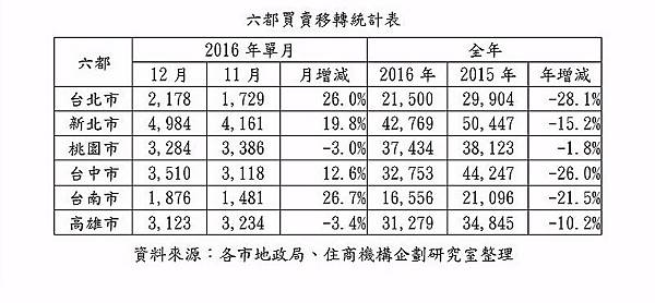 台灣各直轄市政府公佈最新買賣移轉棟數資料,2016 年 12 月相較於前一月大多呈現回暖趨勢,台南市月增 26.7% 居冠,台北市月增 26.0% 居次。至於 2016 年與 2015 年相比則大幅減少,台北市年減 28.1% 最多,台北市的去年移轉棟數並創新低。