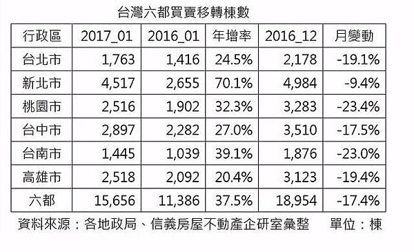 2016年全台房屋買賣移轉棟數 24.5 萬棟,是 1991 年以來的新低量,不過 2017 年已經有築底反彈的趨勢,據六都公布的買賣移轉棟數資料顯示,今年 1 月六都房屋移轉量為 1.6 萬棟,年增 37.5%,表現最好的是新北市,1 月移轉棟數年增高達 70.1%。