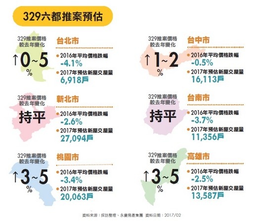信義房屋不動產企研室專案經理曾敬德則表示,2015 年是價格修正最急的一年,2016 年是交易量縮最大的一年,也是交易量的底部,2017 年前 2 個月的移轉量都已經轉正成長,預計第 1 季移轉量也會呈現增加走勢,短期內價格有機會築底找到支撐,但並無反轉向上的動能,畢竟即使六都前 2 月的移轉反彈到將近 2.8 萬棟,但和 2015 年前 2 月的 3.2 萬棟相比,仍有一小段落差,不過整體買氣回籠,交易量回溫跡象明顯,房地產仍可望從去年的 24.5 萬棟底部反彈。