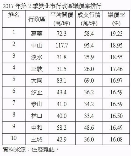 若以大台北各行政區來看,則平均議價率前五名依序萬華、中山、淡水、三峽與大同,議價率從 16% 至 19% 不等,尤其又以萬華的 19.23% 最高。萬華議價率急升的關鍵,在於部份建案成屋後順勢降價、但開價多維持不動,導致議價高升,不過建案銷售狀況卻因此好轉。