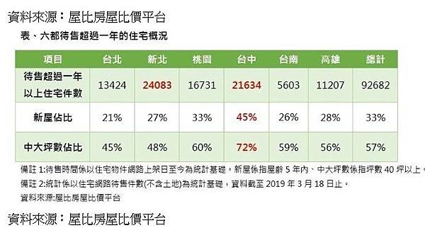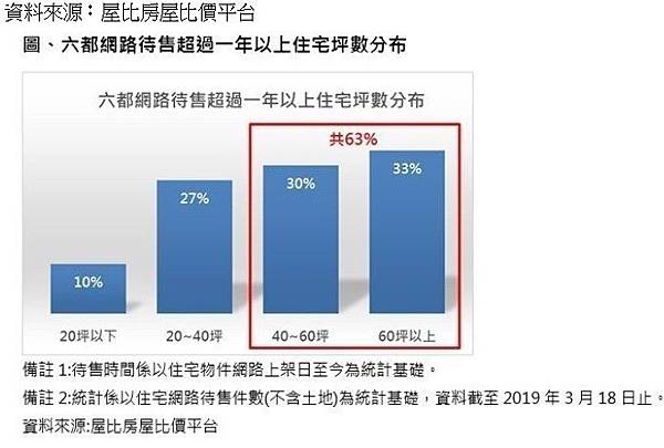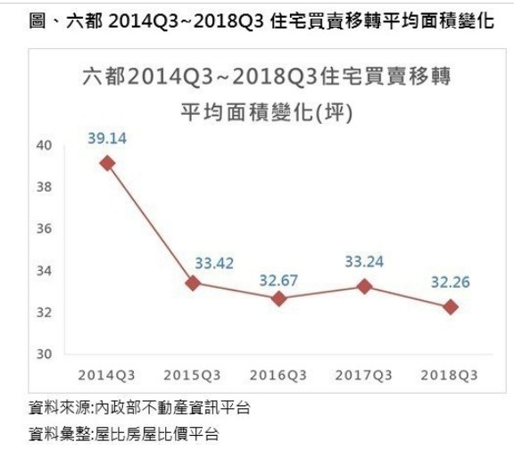 六都待售時間超過一年以上的住宅多達9.2萬間,占六都整體待售量32%。賣一年還賣不掉的住宅,三成以上是新屋,六成以上是40坪以上的中大坪數住宅-63%是40坪以上的中大坪數住宅,33%是新屋-台灣住宅買賣移轉平均面積從2014年Q3到2018年Q3,由39.14坪降到32.26坪,減少6.88坪,家庭購屋需求坪數愈來愈小,對市場中大坪數的產品衝擊相當大 https://goo.gl/ma6UKZ