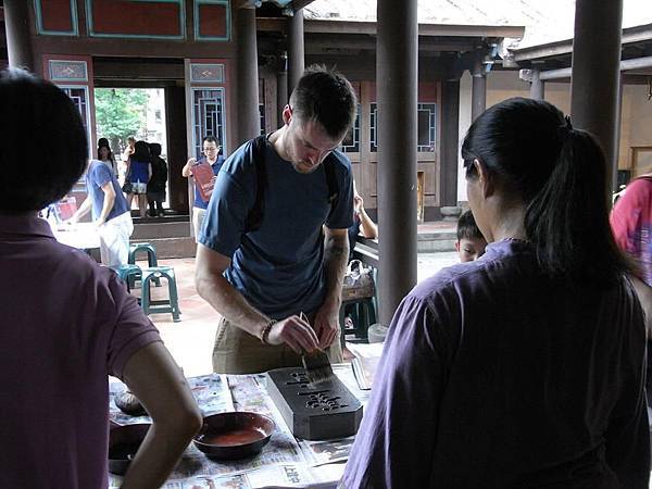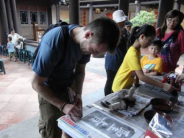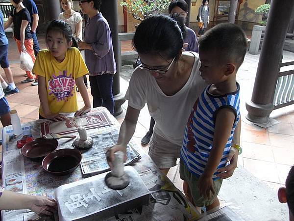 昨天早上、下午各有一場民眾體驗拓碑活動,有些民眾第一次嘗試,一一照步驟進行不敢輕忽,但總因為濕度的掌握不易,成果不同;拓碑的拍打過程中,有些女生力道小,直喊手酸,也有人認為是小兒科,還有一位住在淡水的民眾,說是看到報導特別來回味。