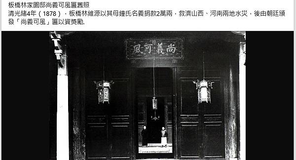 「尚義可風」匾額是光緒四年(一八七八年),林維源以母親鍾氏名義捐款兩萬兩救濟山西與河南兩地水災,朝廷為表彰善行所頒贈與鍾氏的匾額