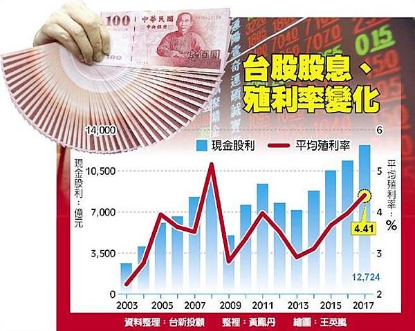 據統計,今年上市櫃公司合計將發出1.27兆元股息,不但創歷史新高,且與2003年的發放2,605億元相比,足足增加超過1兆元,增幅高達3.88倍。