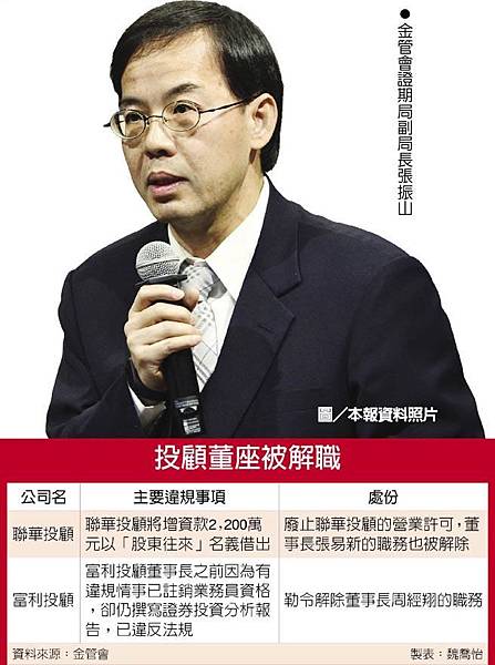 為導正投顧董座把公司當小金庫、屢次違規的歪風,金管會出手一日解除聯華、富利二家投顧董座!金管會證期局副局長張振山昨(15)日表示,聯華投顧不當挪用公司資金,且帳目有虛偽或隱匿的情況,勒令廢止聯華投顧的營業許可,這是近9年來首間被廢照的投顧,董事長張易新的職務也被解除,他未來3年內無法回到證券業。