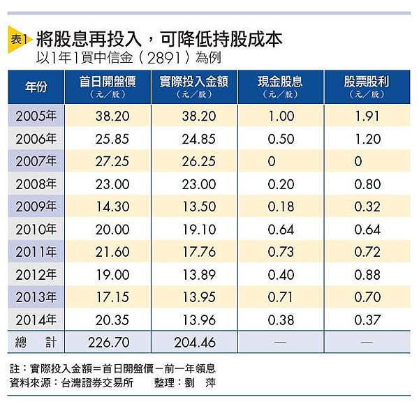 假設從2005年開始,於每年交易首日一開盤時就買進,那麼第1年的投入金額是3萬8,200元;第2年交易首日的開盤價是25.85元,因有前一年領到的股息1,000元可投入,所以實際新投入的資金是2萬4,850元。以此逐年類推,到2014年買第10張股票時,那一年實際投入的資金是1萬3,960元。