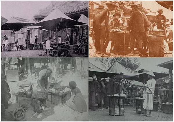 另外,聚集在市街、廟口的攤販,也是外食族另一種選擇。這些攤販沒有桌椅,僅有板凳供客人歇腳,顧客多為附近的居民或勞動者等。在1895年前後日本人剛到台灣時,所見到的都是這些設備簡陋的小吃攤,日本官員笹森儀助描述他跟挑夫在點心攤吃粥,有許多苦力也一起用餐,大家併排坐在一條枯竹竿上,周遭還有豬隻徘徊,構成一幅有趣的景象。