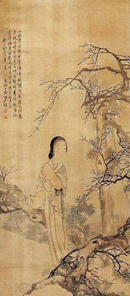 《梅花仕女圖》用圓勁方折的線條表現出仕女的清秀纖細,作為背景的梅花則用沒骨法暈染,在一種迷濛中映襯出仕女的秀雅清麗。