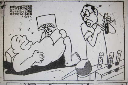 當時最著名的是今津化學研究所開發出來的ィマジ蠅取粉及ィマジ芳香油。今津化學研究所的負責人是今津佛國博士,他所開設的這間研究所專門研發對付害蟲的藥物,像是蒼蠅、蚊子、跳蚤、蟑螂,其中又特別強調對南京蟲的效力。這些除蟲藥劑的發明大大改善當時臺灣社會的生活環境,漫畫反映了這樣的現象。圖2左邊一位躺在席子上的男子,舒適地拿著扇子在扇風,絲毫不怕周遭的飛舞的蚊蟲,右邊則是一位研究者在開發新藥劑,其中一瓶試管就是針對著南京蟲。左上方文字還強調有了這些混合藥劑的發明,從此可不再掛蚊帳。