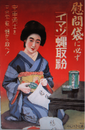 隨著イマヅ蠅取粉及イマヅ芳香油在居家及公共場所防蟲的普及使用,其影響力更擴及到戰場上。在1937年中日戰爭開打後,日本部隊會發給士兵一些「慰勞袋」(圖7)。當時的一些海報上,還會特別強調,除了生活必需品之外,最不可或缺的就是這個攜帶方便的綠色小圓盒イマヅ蠅取粉。這是提供給日軍士兵,在中國江南一帶夜宿時,得以對付南京蟲的良方。