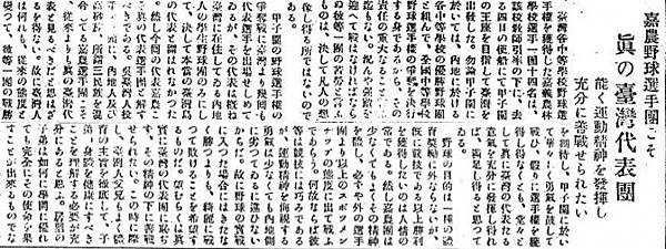 內文提到「甲子園的棒球冠軍爭奪戰中,台灣早已好幾次派出代表隊。然而,大多是居住在台灣的內地(日本)子弟為主,不能算是真正的台灣島代表隊。而這次的嘉農代表隊,才可以說是真正的台灣代表隊。這支球隊以台灣吳姓選手為主投,亦有內地人、高砂族(原住民)等選手,是所謂的三民族混合球隊。」