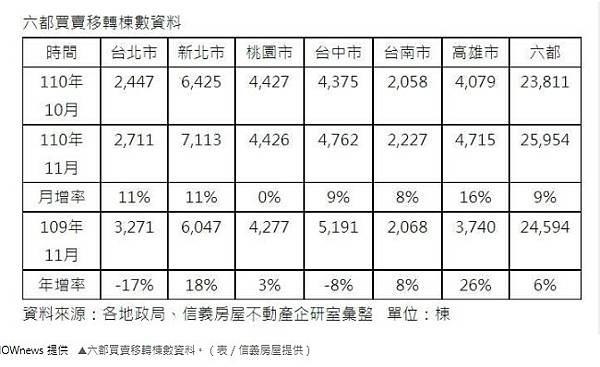 根據六都公告資料,台北市11月移轉棟數2711棟,月增11%,但年減17%;新北11月移轉棟數7113棟,月增11%,年增18%,其中又以三重區、林口區、板橋區增加較多;桃園市則是4426棟,月持平但年微增3%;台中市則是4762棟,月增9%,但年減8%;台南市11月移轉棟數2227棟,月增8%,且年增8%;高雄市則是11月拉高至4715棟,反映當地房市交易大幅增溫,移轉棟數增幅位居六都之冠,月增16%,且年增26%。