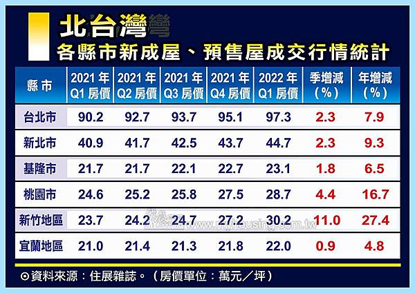 住展雜誌發言人陳炳辰指出,除了桃園市開價相對保守以外,台北市、新北市與新竹地區都仍維持在高檔,儘管近期房市買氣低迷,但在地段與品牌加持下,建商不輕易低頭,持續開出高價位新案。