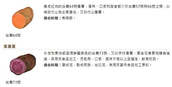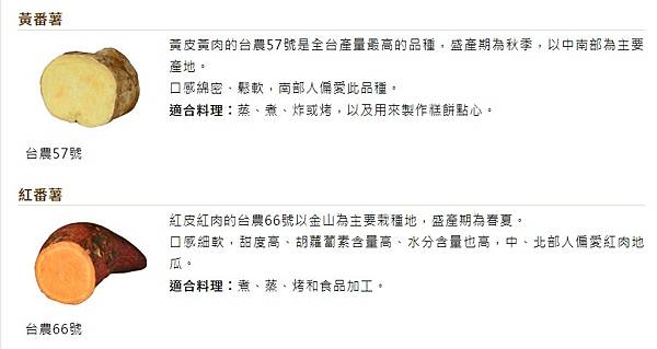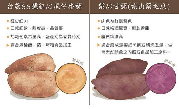 台農66號:春夏季節盛產,俗稱紅心地瓜或紅心尾仔蕃藷,紅色外皮肉色呈橙紅色,內質水份含量較高,鬆軟中帶點粉泥的口感,甜度高,適合蒸煮、烤以及煮地瓜飯、粥、湯。