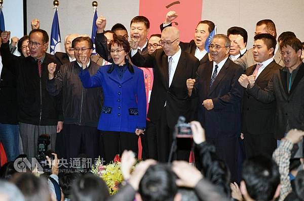 前副總統吳敦義(前中)9日在台北台大國際會議中心 召開記者會,宣布參選國民黨黨主席,和與會國民黨立 委一起呼口號加油打氣。 中央社記者施宗暉攝 106年1月9日