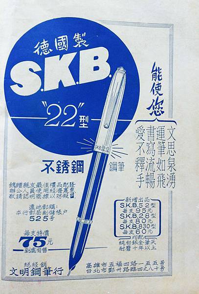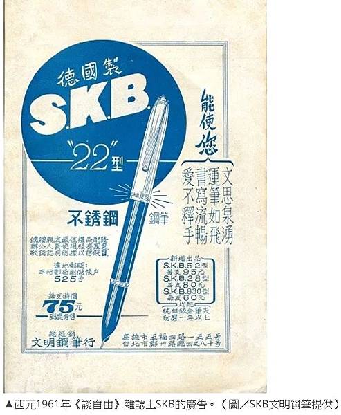 民國50至60年鋼筆盛行時期,SKB文明鋼筆公司曾砸大錢,在「自由談」雜誌首頁刊登廣告,推銷主打商品「22型鋼筆」。記者蘇郁涵/攝影