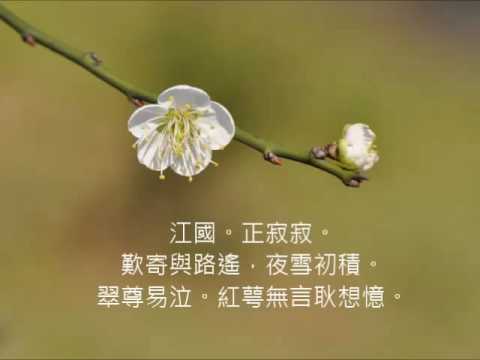 苔枝綴玉,有翠禽小小,枝上同宿。客里相逢,籬角黃昏,無言自倚修竹。昭君不慣胡沙遠,但暗憶、江南江北。想佩環、月夜歸來,化作此花幽獨。猶記深宮舊事,那人正睡裡,飛近蛾綠。莫似春風,不管盈盈,早與安排金屋。還教一片隨波去,又卻怨、玉龍哀曲。等恁時、重覓幽香,已入小窗橫幅。(疏影)