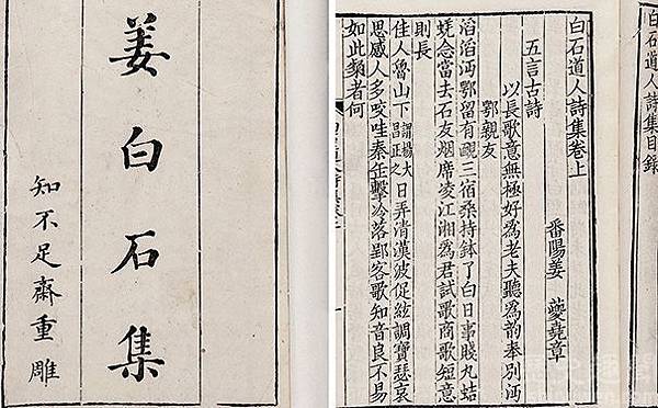 不過,被那麼多的權貴名公賞識,並沒有改變白石“窶困無聊”的境遇,這大抵是因為白石心性清高,決不會主動說出乾謁求進的話來。惟有南宋大將張俊的曾孫張鑑字平甫者,主動資助白石,歷十年之久,與白石情甚骨肉。