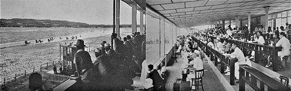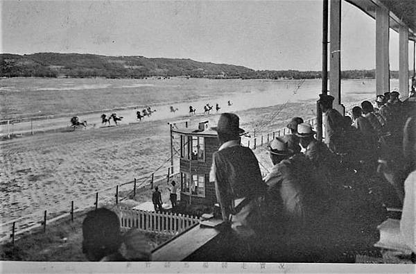 1928年臺北舉辦第一場具賠率的「臺北乘馬會」,之後全臺灣各地也陸續舉行競馬活動。到了1930年代各地正式的競馬場一一成立,每年春、秋兩季環島舉行賽馬,成為全臺灣盛大的娛樂活動。影像中是1936年新落成的「臺中州競馬場」,可看到騎手與馬匹正在跑道上準備。(2) 臺灣古寫真上色x今昔時光機交流團 | 罕見臺中大肚山競馬場影像數位上色 | Facebook https://bit.ly/32HbbZ1