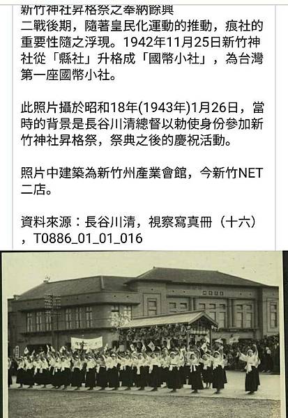 此照片攝於昭和18年(1943年)1月26日,當時的背景是長谷川清總督以勅使身份參加新竹神社昇格祭,祭典之後的慶祝活動。
