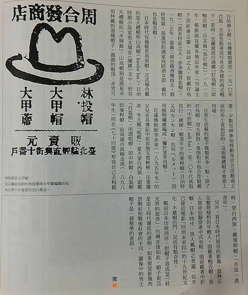 瓜皮帽、圓頂禮貌、中折帽、鳥打帽、打鳥帽、鴨舌帽、大禮帽、山高帽、麥桿帽、白盔帽;社交界的旅券、日出向鳥印