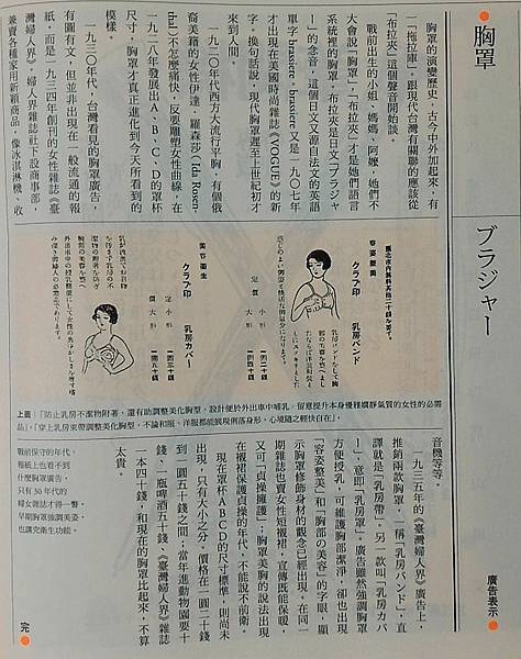 1920年西方流行平胸,1928年流行ABCD胸罩,1934年台灣婦人界 雜誌,1935年台灣婦人界 雜誌發展出乳房帶、乳房罩