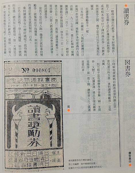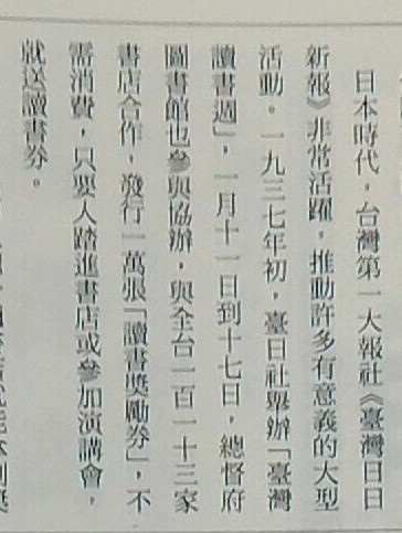 日本時代重視社會讀書風氣,獎勵讀書,除了全台圖書館、文庫也訂有讀書週。總督府與日日新報報社1937年還發行讀書獎勵券鼓勵大眾進入書店買書,參加文藝活動及演講會
