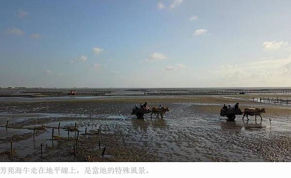 彰化縣海牛觀光協會理事長洪永化:「牛車可以載的是幾個人而已,總統也來看過了馬英九他也有下海,他也有他坐的是牛車別人坐的是三輪車。」