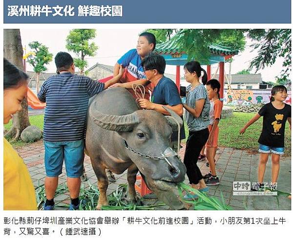 「牛」老師上課囉!彰化縣莿仔埤圳文化協會配合溪州黑泥季即將登場,由拖拖拉拉牛耕隊長高一鑫帶著水牛「拉拉」,前進溪州鄉各小學校園「教學」趣,小朋友邊聆聽「新鮮」的牛故事,還體驗餵牛、騎牛背,甚至不知不覺將牛糞當成黏土捏。