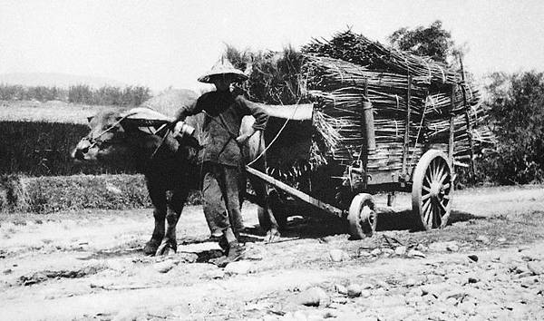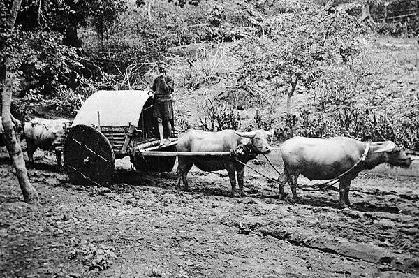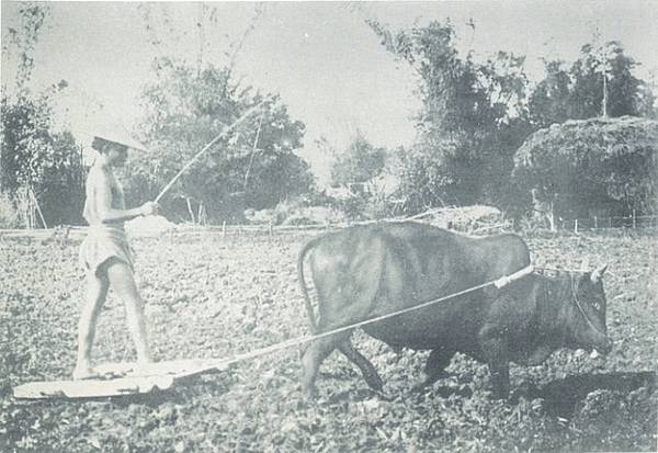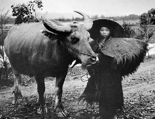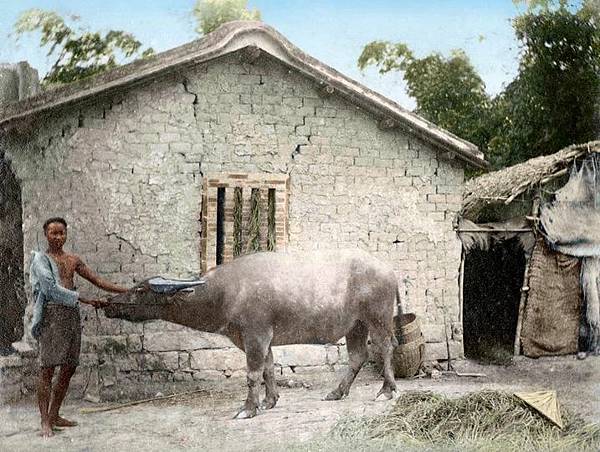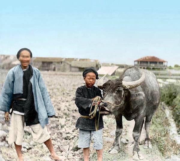 1900年,農民帶著田中的水牛。台灣飼養的水牛,從荷蘭時期開始,即隨著先民渡海來台陸續引進,在台灣的開拓史上,成為農村的主要農耕動力。農業時代的水牛,宛如農家的家人一樣,農民對牛有很深的情感,拒吃牛肉。照片中的農地,已被水牛翻鬆過。農村少年,更是最佳的牧童。(1) 英國攝影家湯姆生1871臺灣線性文化遺產 | 台灣農民與水牛 | Facebook https://bit.ly/3QtXbW6