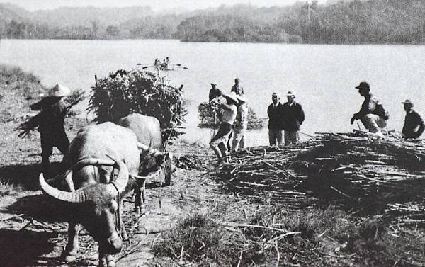 日治時期竹筏運蔗經水路再轉牛車接送舊照