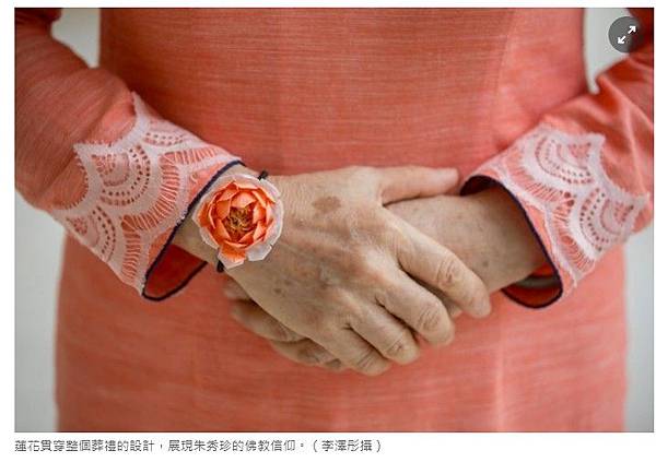 喪禮是人生走到盡頭時,最後的總結。設計系學生方晴按着朱秀珍婆婆開通、無欲無求的人生態度、活潑個性和佛教信仰,專屬設計象徵佛教的蓮花圖案標誌,更反傳統的喪事黑白配色,選擇了暖橙色,不僅用在紀念冊、吉儀上,甚至繡在旗袍壽衣上,充滿朱秀珍婆婆的個人特色。朱秀珍婆婆更讚賞學生李彥琪設計的旗袍壽衣的蓮花刺繡精細,對於按她的想法選擇麻質布料也甚感滿意。