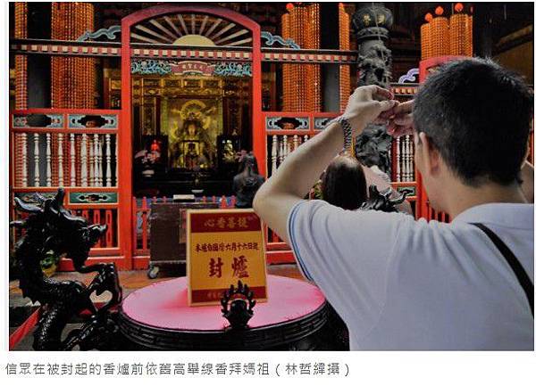 信眾在被封起的香爐前依舊高舉線香拜媽祖(林哲緯攝)