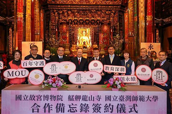 今(9)日龍山寺黃書瑋董事長、師大吳正己校長、故宮蕭宗煌院長,於龍山寺代表雙方簽署合作備忘錄,現場師大藝術學院莊連東院長、美術館劉建成館長、文保中心張元鳳主任、設計學系蘇文清主任、藝術史研究所蔡家丘所長、故宮黃永泰副院長、立法委員吳沛憶、文化總會李厚慶秘書長、文資局文資中心陳柏欽主任等蒞臨見證。