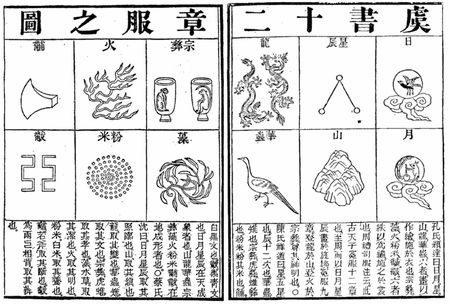 《尚書.虞書.益稷》記載,舜帝曰:「予欲觀古人之象,日、月、星辰、山、龍、華蟲,作會;宗彜、藻、火、粉米、黼、黻,絺繡,以五采彰施於五色,作服,汝明。」