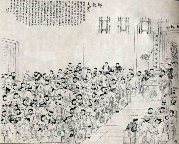 在中國傳統法律文化當中,有一項獨具特色的內容叫做“鄉飲酒”,它通過官府定期組織聚會飲宴這樣一種方式,推行禮儀教化,宣傳法律精神,融洽鄰里關係,化解糾紛矛盾。這種儀式源自周代,經漢唐至明清一直延續。“鄉飲酒”有著嚴格的程序和規則,每年的正月,由官府的人員召集,人們以百家為單位參加。“鄉飲酒”表面上看是一種飲酒聚餐的集會,實際上是一種推行德政、教化民眾的社會活動,“鄉飲酒”的一個重要目的就是教育人們和睦親鄰、尊奉高年。一方面用禮樂這種溫和的方式弘揚禮遇賢能、友善互助的社會風氣,以起到凝聚人心、穩定秩序的作用;另一方面也使得彼此朝夕共處的鄉村鄰里能夠同餐共飲,暢敘心情,融洽關係,化解矛盾。既增進了人與人之間的感情聯絡,又使得一些生活中的糾紛和爭執消釋於未發之前。
