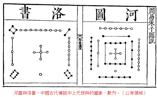 河圖與洛書,中國古代傳說中上天授與的圖象、數列。(公有領域)
