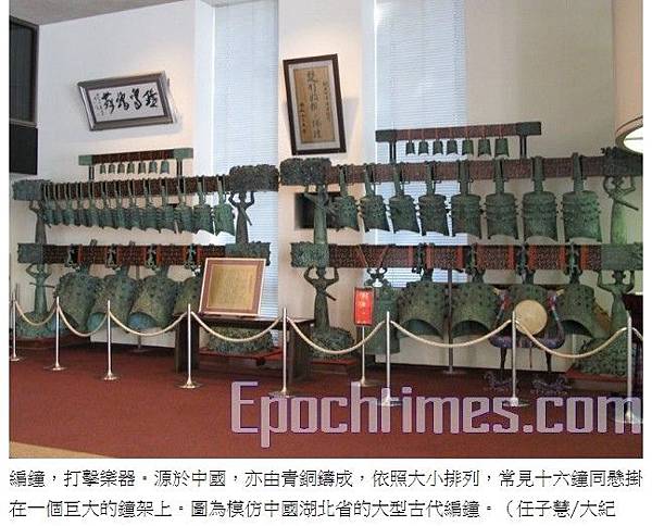編鐘,打擊樂器。源於中國,亦由青銅鑄成,依照大小排列,常見十六鐘同懸掛在一個巨大的鐘架上。圖為模仿中國湖北省的大型古代編鐘。(任子慧/大紀元)
