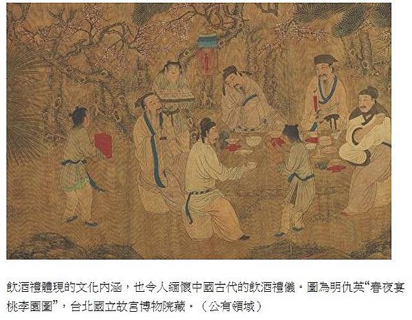 飲酒禮體現的文化內涵,也令人緬懷中國古代的飲酒禮儀。圖為明仇英“春夜宴桃李園圖”,台北國立故宮博物院藏。(公有領域)