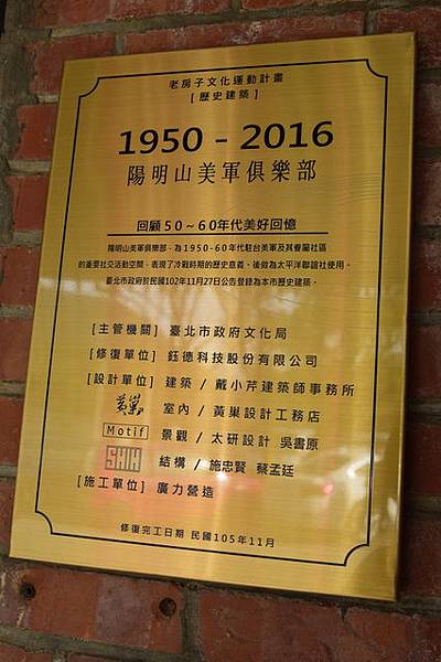 陽明山美軍俱樂部,現已改名為「Brick Yard 33 1/3」,Brick Yard是紅磚及庭院,33 1/3是黑膠唱片的轉速:每分鐘33又 1/3轉。