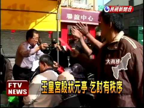 農曆正月初九是台灣習俗的天公生,也就是玉皇大帝的生日。高雄市玉皇宮向來香火鼎盛,天公生前一天入夜11點後就人聲鼎沸,也就吸引不少遊民在玉皇宮前排隊等著香客捐獻零錢,為了管理這群遊民,街友關懷協會行德宮將這140名的街友規範在〝狀元亭〞內,並要求不能對捐獻香客重複募款,須遵守協會的安排,由於三餐都是行德宮供應,街友也識相聽從指示,成了天公生特殊景象。(林振義/高雄報導)