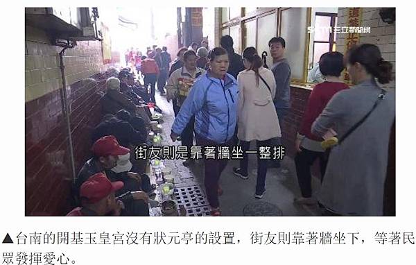 高雄市街友關懷協會行政主任林紘義:「我們都會跟他們講說你們如果太躁動,那這樣子捐款人可能會被你們嚇到以後都不來,那慢慢勸導之後,現在都非常穩定。」不像高雄玉皇宮的街友人數眾多,來到台南開基玉皇宮,街友則是靠著牆坐一整排,等民眾發揮愛心,越靠近出入口位置越好。想在初九天公生多拿點民眾善心捐助,怎麼卡位成了重要關鍵。(整理:實習編輯陳冠勳)