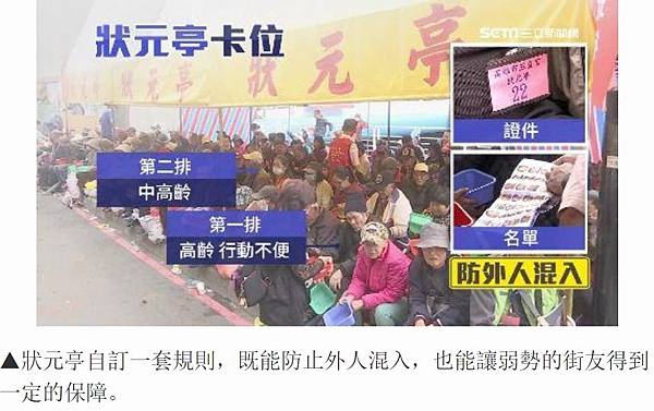 高雄市街友關懷協會行政主任林紘義:「比較經濟弱勢的,然後再來是行動不便的,身心障礙、中高齡為主,為優先考慮的一個對象。」不讓秩序大亂,嚇到廟宇參拜香客,狀元亭自有一套管理規則,確保來到狀元亭的街友是最弱勢的一群,志工隨時拿名冊對照檢查,坐在第1排的以高齡行動不便街友為主;第2排是中高齡街友,所有人脖子上要掛上寫有編號證件再對照名單,防止有心人魚目混珠。