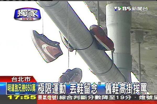台北新生高架橋下整排舊鞋子,不只路人看了一頭霧水,里長更憂慮掉下來會砸傷人,其實國外常見極限運動選手將值得紀念的鞋子,高掛在得獎或是自己練習的場地,拿下年度最佳滑板手的選手,也曾親自在台北掛上一雙鞋;市府將規劃「掛鞋區」並立牌解說,尊重極限運動文化,也解開「飛鞋」秘密。